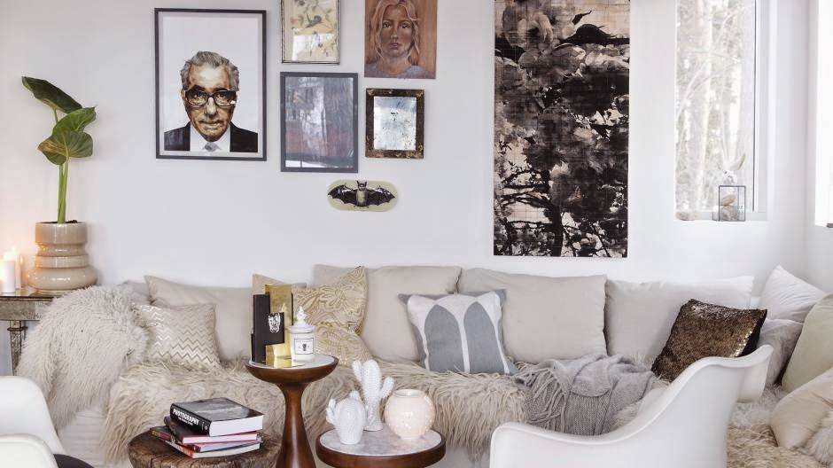 Persoonlijk hou ik niet van heel veel kleur in mijn huis. Ik hou wel van dessins, combineer een kleed met grijze strepen met een vaalgroen gekleurde kelim en ik gooi kussens met allemaal verschillende dessins in de mix. Daarom hou ik de kleuren rustig: zwart, bruin, wit, grijs en nu dus een beetje groen. Wie wat bewaart heeft wat, dus soms duik ik mijn kasten in en haal wat andere vazen of kandelaars tevoorschijn. Een kleurenprinter en slim zoeken op het internet zorgen voor de afwisseling op de muur.