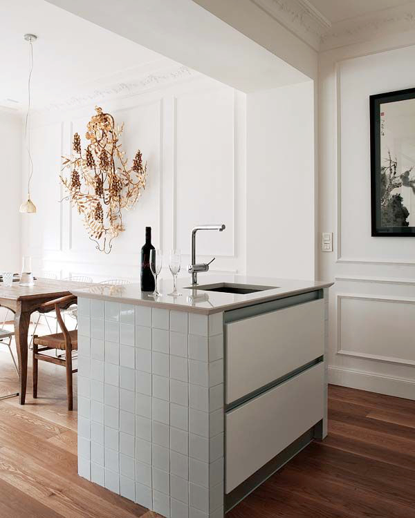 Gisteren droomde ik over een appartement in Londen met een etnische feel; vandaag val ik voor dit eclectisch ingerichte appartement in Spanje. Eclectisch vanwege de mix van stijlen, windstreken en perioden; prachtige dressoirs, vazen en lampen uit de jaren 70, La Chaise van Eames (je ziet hem nog net staan voor het raam) is een ontwerp uit de jaren 50 net als de draadstoeltjes aan tafel van Harry Bertoia, beiden via Flos. Die draadstoeltjes vind ik trouwens fantastisch gecombineerd met de tafel met barok pootjes. In de slaapkamer ligt de vloer vol Marokkaanse Beni Ouarain kleden en heb je aan de muur bij de eettafel die barokke lamp gezien? De bewoners hebben hem gewoon naast de loeistrakke keuken gehangen. Ik pas wel op het huis als jullie weg zijn........